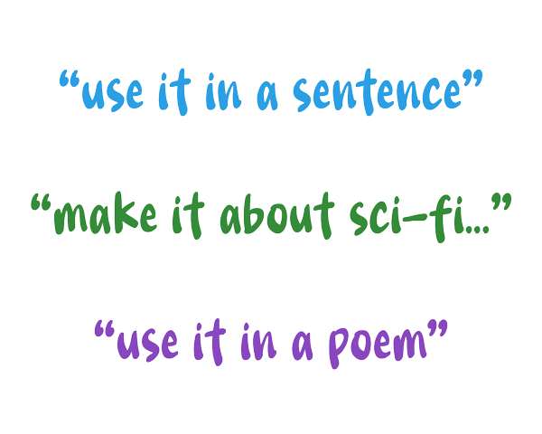 DEFINITIONS MUST MATCH CONSTRAINTPlayers have to create definitions that match a constraint. 'Use it in a sentence,' Use it in a song', 'Use it in a poem', etc.). The SLEUTH decides at the beginning of their turn what constraint they want to apply. It addition to above, other constraint's could be things like "a person, a place, a thing", "related to a Film", 'related to the outdoors' or anything else the SLEUTH decides